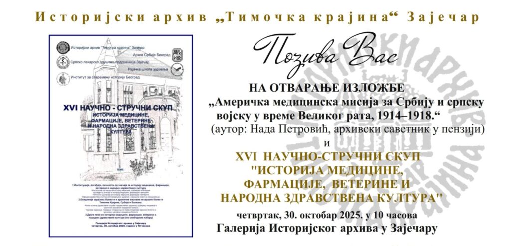 Данас је у Историјском архиву „Тимочка крајина“ Зајечар бити отворен 16. научни скуп „Историја медицине, фармације, ветерине и народна здравствена култура“. У оквиру отварања скупа, у Галерији Архива отворена је и изложба под називом „Америчка медицинска мисија за Србију и српску војску у време Великог рата (1914-1918)“, аутора Наде Петровић.