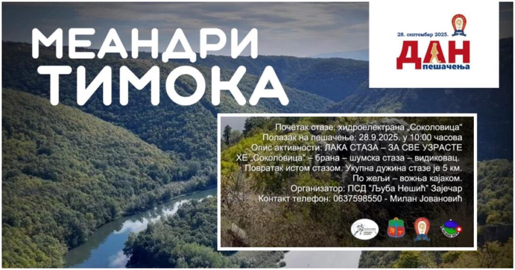 Планинарско смучарско друштво „Љуба Нешић“ из Зајечара организује промотивни излет до меандра Тимока у близини Соколовице, поводом обележавања Дана пешачења. Ова манифестација представља део шире иницијативе коју у бројним градовима спроводи Планинарски савез Србије, са циљем да се пешачење и планинарење приближе грађанима као вид здравог и активног начина живота. Планирана траса је једноставна и прилагођена свим генерацијама, а у оквиру излета ће, за заинтересоване, бити организована и вожња кајаком.